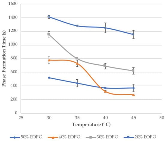 Phase formation time and temperature was studied by heating the cultures with different EOPO 970 concentration (20, 30, 40, and 50% v/v) in a water bath until reaching 30, 35, 40, and 45 °C culture temperature, and recording the time needed at each temperature to visualize phase formation. In Figure 4, the results of such analysis are depicted, where it is clear that, at higher temperatures, lower times are needed for phase formation regardless EOPO concentration in the culture. However, it is clear that higher EOPO concentrations require less time and temperature for phase formation, being at 40% and 50% EOPO the most attractive alternatives, where 4 to 6 min are needed in order to observe phase formation at 30 to 45 °C. More importantly, after 6 min of phase formation time, higher temperatures do not provide conditions for significantly lower formation times in cultures with 40% and 50% EOPO concentration.
