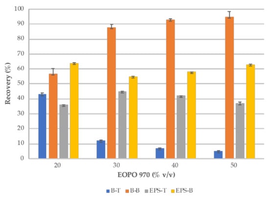 After phase formation with 20, 30, 40, and 50% v/v EOPO 970 concentration, each phase (bottom and top phase) was separated for biomass and EPS quantification. Figure 5 shows both biomass and EPS recovery % for each separated phase. Cultures with 30, 40, and 50% EOPO 970 concentration showed a biomass separation predominantly to the bottom phase with recoveries from 88% to 95%, while EPS also partitioned predominantly to the bottom phase with recoveries from 37 to 45%. It is important to note that cultures with 40% and 50% EOPO 970 provided the best conditions for biomass and EPS separation on different phases. For systems with 40% EOPO concentration, 7% of biomass and 42% of EPS is recovered on the top phase and 93% of biomass and 58% of EPS can be recovered in the bottom phase. For 50% EOPO 970, a similar behavior was observed, since 5% of biomass and 37% of EPS is recovered on the top phase; while 95% biomass and 63% EPS can be recovered in the bottom phase. Although said systems do not provide conditions for full EPS and biomass partition to different phases, said EOPO 970 concentrations have potential for biomass and EPS separation on continuous flow extraction, since EPS could be recovered on the extracting phase and further separated with other methods.