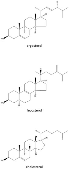 155. Endress, E.; Bayerl, S.; Prechtel, K.; Maier, C.; Merkel, R.; Bayerl, T.M. The effect of cholesterol, lanosterol, and ergosterol on lecithin bilayer mechanical properties at molecular and microscopic dimensions: A solid-state NMR and micropipet study. Langmuir 2002, 18, 3293–3299. [Google Scholar] [CrossRef]