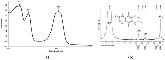 Proton nuclear magnetic resonance is often used to characterize structural properties of various molecules [29,31]. The 1H NMR spectrum of the isolated red pigment dissolved in alkaline D2O is presented in Figure 1b. The 1H NMR profile contains all the signals typical for this compound (CH3, CH2 and CH, belonging to isobutyl groups) [32]. The small satellite low-field peaks observed for CH3 and CH protons may be tentatively ascribed to the presence of conformational isomers. The large solvent peak is typical for analyses carried out on solutions in D2O. It contains a residual amount of ordinary hydrogen isotope (protium), which results in characteristic resonance at about 4.8 ppm. It also indicates traces of H2O/DOH, which are always present in D2O. The signals are widened due to the presence of hydrogen bonds.