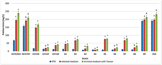 The production of pulcherrimin was presented as the mean ± SD of three separate experiments. The mean values results were compared using one-way repeated measures analysis of variance (ANOVA; OriginPro 8.1, OriginLab Corp., Northampton, MA, USA). The results obtained in minimal medium were compared with the YPD cultures. Values with different letters are statistically different; a: p ≥ 0.05; b: 0.005 < p < 0.05; c: p < 0.005.