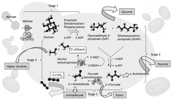In Stage 1 of alcoholic fermentation, free glucose is assimilated first, followed by the hydrolyzation of maltose or other disaccharides into two glucose, by the enzyme alpha glucosidase (a.k.a maltase, EC 3.2.1.20). Several other enzymatic destabilization and phosphorylation reactions then happen in Stage 1, which turns the substrate into glyceraldehyde-3-phosphate (G3P) and dihydroxyacetone phosphate (DHAP). Stage 2 oxidizes G3P and DHAP, as well as the ADP generated previously, to create ATP as energy for the cell and pyruvate. Stage 3 enzymatically decarboxylates pyruvate to acetaldehyde and CO2 that leaves the cell, before the alcohol dehydrogenase converts the acetaldehyde to ethanol in Stage 4 (Figure 2). In brewing, yeast is typically reused (repitched) for ten generations or more [], while in wine, the yeast is generally used far lesser times, due to the prominence of other microorganisms and the higher mortality from more stressful conditions of osmotic pressure and higher ethanol concentrations []. In most cases, serial repitching can cause genetic mutation within the cells and the desired flavor profile might no longer be attainable [,,,].