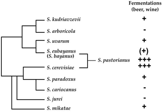 S. paradoxus is one of the first isolates of the Sss [], a wild-type strain commonly isolated from the bark of deciduous trees and occasionally from fruit and insects in North America and Eastern Europe [,,]. Even though genetically S. cerevisiae and S. paradoxus were proven to be distinct species [], phylogenetically the two were the closest relatives in the Sss (Figure 3) and were 90% genetically similar []. They share the same morphological and phenotypic characteristics, such as being spherical or ellipsoid in shape, with a diameter of 1–5 µm []. Previous research indicates mixed results of the fermentative capacity of S. paradoxus, but it has the ability to convert glucose into ethanol and a relatively high alcohol tolerance [,,]. It is a positive fermenter for glucose, sucrose, and maltose, but it does not ferment lactose, melibiose, or starch (Table 2). Little evidence exists for the domestication and commercial use of S. paradoxus in alcohol fermentation, but it was found to be naturally co-fermenting with S. cerevisiae in Eastern European wine fermentations [,], as well as with S. cerevisiae, S. bayanus, S. cariocanus, S. kudriavzevii, S. mikatae, and S. pastorianus in indigenous African sorghum beer [].