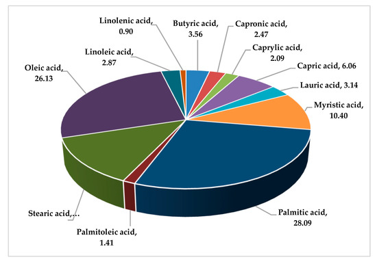Lipolysis is another important biochemical event occurring during cheese ripening, and consequently, it has been more extensively studied in hard than in fresh cheese [36]. Lipolysis consists of the enzymatic cleavage of the triglycerides ester linkages between glycerol and fatty acids, producing glycerol, FFA, mono- and diglycerides. This process is very important for the quality and sensorial properties of cheese, considering that the released FFAs can be precursors of volatile compounds such as methyl ketones, secondary alcohols, esters and lactones that contribute to cheese flavor [31,37]. Table 4 reports a descriptive statistic of the free fatty acid content (FFA) in sheep and goat Fruhe cheese.