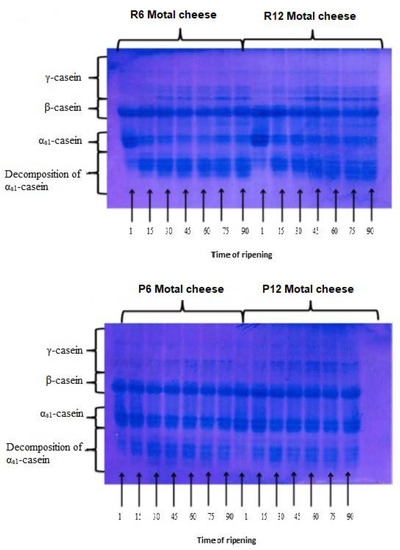 Decomposition in αs1 and β-casein and production of secondary products obtained from that in cheeses made from raw milk was more intense than cheeses made from pasteurized milk. According to Figure 1, rate of β-casein decomposition in R12 Motal cheeses was higher than other cheeses on day 90. The results of this study are in agreement with data reported by Pisanu et al. [45], who evaluated cheeses prepared with raw and pasteurized ovine milk on peptide profile. These authors showed that cheese made from raw milk had higher decomposition in αs1 and β-casein than cheeses made from pasteurized milk. Since the soluble nitrogen and protein nitrogen are the primary proteolysis index, applying the heat treatment has a significant effect on both primary and secondary proteolysis. At day 90, the amount of αs1-casein hydrolysis in the cheeses produced from raw milk (R6 and R12) was more than cheeses produced from pasteurized milk (P6 and P12). In addition, the β-casein bands slowly decreased during ripening, but its decrease was lower than αs1-casein, which demonstrated that β-casein is more resistant to proteolysis and its hydrolysis than αs1-casein. β-casein hydrolysis is affected by plasmin activity [46]. The difference between the amount of soluble nitrogen and casein decomposition between the cheese prepared from raw milk and pasteurized milk can also be due to the activity of non-starter peptidases in the raw milk. Furthermore, the presence of denatured whey proteins in pasteurized milk can affect the accessibility of proteases to casein [47]. Since the low storage temperature of cheese during the ripening prevent the activity Chymosin [46], we can conclude that, in the cheeses ripened at low temperature, the αs1-casein decomposition is lower than the cheeses ripened at high temperature.