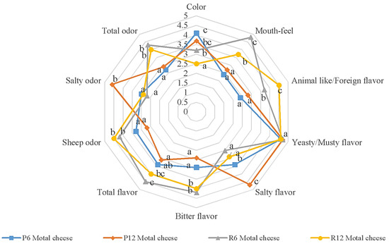Sensory characteristics of cheese at the end of ripening period. a, b, c Data differ significantly (p < 0.05).