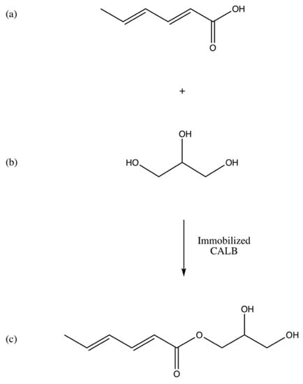 Between sorbic acid and glycerol catalyzed by immobilized lipase B from C. antarctica. (a) sorbic acid, (b) glycerol, (c) glycerol ester of sorbic acid.