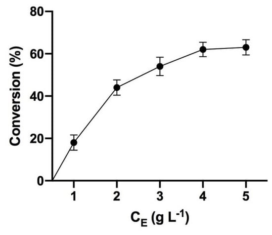 The effect of enzyme concentration on the conversion of sorbic acid has been evaluated through reverse-phase HPLC and allowed us to set up the enzyme concentration to 4 g L−1. As shown in Figure 2, the conversion yield increased with the amount of enzyme following a hyperbolic trend typic in the esterification reactions lipase catalyzed. At higher enzyme concentrations, more active sites are present for substrate binding. Therefore, the reaction rate increases. No improvement is observed after 4 g L−1, so these values were selected as the most adequate enzyme concentration.