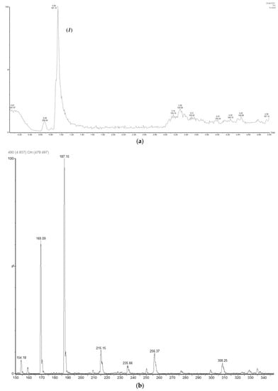 uHPLC-MS identification was carried out using an Waters Acquity UPLC equipped with a ZQ 2000 ESI mass spectrometry (Waters, Milford, MA, USA) and Mass Link software (Waters, Milford, MA, USA). The 2.6 µm Kinetex 50 × 4.6 mm C18 column was chosen to perform the analysis. The mobile phases used were water with 0.1% formic acid as solvent A and acetonitrile with 0.1% formic acid as solvent B. The liquid chromatography ran in a gradient condition from 100% H2O at t0 to 100% acetonitrile at t5 (5 min) under a flow rate of 0.3 mL/min. The column operated at a stationary temperature of 40 °C. Temperature, nebulizer pressure, and flow rate of drying gas (N2) were, respectively, 230 °C, 35 psi and 10 L/min. The further operation parameters were 1200 V for nozzle voltage and 2500 V for the capillary voltage. Mass spectra were tracked in a mass-to-charge (m/z) ratio range of 150–500 in positive ion detection mode.