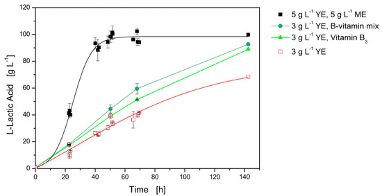 Based on a study of Klotz et al. [18], that analyzed the composition of the used yeast and meat extract, a synthetic B-vitamin mix was designed. The tested concentration of each vitamin corresponds to a mixture of 5 g·L−1 yeast extract and 5 g·L−1 meat extract. To identify B-vitamin requirements for L. casei, each vitamin was added separately to limited MRS medium with 3 g·L−1 yeast extract (Figure 1). With the nutrition limitation, an l-lactic acid concentration of 68.4 g·L−1 was reached after 140 h. All single vitamin addition, except niacin (Vitamin B3), resulted in 67.3 g·L−1 ± 5.5 g·L−1 l-lactic acid with a remaining glucose concentration of 52.4 g·L−1 ± 5.5 g·L−1, and the added vitamins did not influence cultivation in the tested concentrations. The addition of niacin had a considerable positive impact on the cultivation, resulting in a final titer of 88.9 g·L−1 l-lactic acid and a yield of 0.90 (w/w) ± 0.01 (w/w). This titer was slightly lower than the cultivation with the B-vitamin mix, with 92.6 g·L−1 l-lactic acid and a yield of 0.93 (w/w) ± 0.02 (w/w). Also, the tests with addition of niacin and the total B-vitamin mix did not result in a total conversion of the substrate in 140 h, and 18.6 g·L−1 ± 2.6 g·L−1 glucose still remained. In total, the maximum productivity was clearly below the maximum productivity of the reference cultivation with modified MRS medium (5 g·L−1 yeast extract and 5 g·L−1 meat extract), which is on average 3.9 g·L−1·h−1, whereas the yield was constant at 0.93 (w/w) ± 0.05 (w/w). On average, the max. productivity of the single tested vitamins was 0.93 g·L−1·h−1, using niacin the value increased to 0.99 g·L−1·h−1 and for the B-vitamin mix to 1.15 g·L−1·h−1.