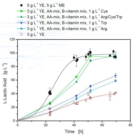 Similar to the investigation of B-vitamin requirements, amino acid (AA) requirements were evaluated by adding an amino acid-mix to the medium. Like the B-vitamin mix, the amino acid mix is based on composition and concentration of the amino acid profile of 5 g·L−1 yeast extract and 5 g·L−1 meat extract. Without using any complex media compound, and supplementing the media with the amounts of B-vitamins and amino acid that exists in 5 g L −1 yeast and 5 g L−1 meat extract (synthetic MRS medium), a l-lactic acid titer of 10.9 g·L−1 with a yield of 0.55 (w/w) ± 0.04 (w/w) after 70.5 h was achieved, whereas the reference cultivation with 5 g·L−1 yeast extract and 5 g·L−1 meat extract resulted in approximately 99 g·L−1 l-lactic and a yield of 0.91 (w/w) ± 0.02 (w/w) and total glucose consumption. Even the limited MRS medium with 3 g·L−1 yeast extract had an l-lactic acid titer of approximately 40 g·L−1, which was noticeably higher than the synthetic MRS medium.
