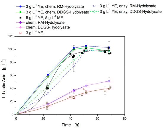 The hydrolysates were tested without the use of yeast extract and with limited MRS medium with 3 g·L−1 yeast extract (Figure 3). For all investigations with hydrolysates, the total nitrogen content was comparable to 5 g·L−1 yeast extract and 5 g·L−1 meat extract. Using hydrolysates without the addition of yeast or meat extract, the l-lactic acid titer averaged 51.4 g·L−1 after 68.5 h, which was half of the titer of the reference cultivation with 5 g·L−1 yeast extract and 5 g·L−1 meat extract.