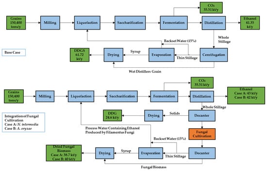 A 1st generation ethanol plant, which uses wheat grains as feedstock, located in Norrköping, Sweden, was considered as the base case process. Simulation of this process was prepared, according to Rajendran et al. [] and Vathsava Rajoli []. Two alternative processes were investigated in comparison to the base case, based on experimental and literature data from the previous studies. Both of these processes included filamentous fungi integration into the base case process in order to valorize thin stillage through conversion into ethanol, CO2, and protein-rich fungal biomass. The fungi integrated process was designed according to Rajendran et al. [] with some modifications. The main difference was related to biomass and ethanol yields obtained from the fungal cultivation in thin stillage. Case A and Case B differed regarding the type of fungal species used. In Case A, a fungus that could produce 16 g/L biomass and 5 g/L ethanol from thin stillage was used, while in Case B, a higher biomass and lower ethanol producer fungus was introduced into the process []. Aspen Plus® (v.11) (Aspentech, Bedford, MA, USA) simulation program was used. Metric units were used throughout this study.