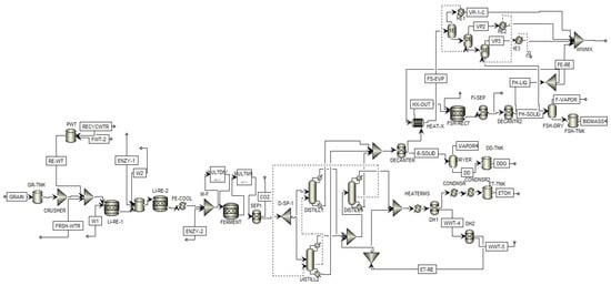 In the base case process, 18.8 ton/h of wheat grains were fed to the crusher, where the particle size was reduced to 0.5 mm. The milled wheat flour was mixed with water, and then the slurry was fed consecutively into the first (70 °C) and second (88 °C) liquefaction tanks, where α-amylase was added for dissolution and partial hydrolysis of starch. A heat exchanger cooled down the outlet of the liquefaction unit to the fermentation temperature (33 °C). The feed was sent to five fermenters with glucoamylase addition for the completion of starch hydrolysis into glucose. The retention time of the fermenter was 2.78 days. Following ethanol fermentation with yeast, CO2 was separated by a scrubber to be sold. The fermentation mash was fed into two distillation columns where the ethanol was concentrated to 45% and further concentrated to 80% in the 3rd distillation column. Tray pressures of distillation columns were 0.3, 0.7, and 1.52 bar, respectively. In order to remove the water from ethanol further than the azeotropic point and obtain the final product, namely, 99% ethanol, the vapor stream from the 3rd distillation column was sent to the dehydration columns. The purified ethanol obtained from the dehydrator was cooled down to 30 °C and stored in storage vessels for 3 days. The bottom stream of the distillation columns, called whole stillage, was sent to the decanter, where the supernatant, thin stillage, was separated from the solid cake (wet distillers’ grain). Thin stillage was concentrated into syrup through a series of three evaporators, while 15% of the initial thin stillage was used as backset water in the process. Multi-effect evaporators were simulated by modifying the conditions in Franceschin et al. [], to keep a minimum ΔT of 10 °C for each evaporation unit. The syrup and the solid fraction coming from the evaporators and decanter, respectively, were sent to the dryer, which worked at 103 °C at 1 atm, to obtain the main side product, DDGS, which is sold as animal feed []. Storage vessels for grain and products were assumed to have 3 days retention time, except CO2, which was assumed to be sold directly.