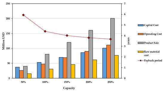 The same process, but in different capacities, exhibits different results in terms of investment parameters. The location of the plant and ease of access to raw materials and utilities and the potential of selling products reaching the target market can be effective factors upon deciding the plant capacity. On the other hand, the capital investment of the plant, which changes by the capacity, and the length of time that the money invested that can be gained back are significant decision parameters for investors. Hence, a capacity change analysis was carried out to present the opportunities for various conditions. The capacity changes applied were a reduction of 50% in capacity and an increase of capacity by 150%, 200%, and 250%. Capacity with 100% refers to the initial process, which operates 8000 h/year and has 150,400 tons of grain annual processing capacity. In Table 2, the capacity change is shown in detail. Besides, the investment analysis results for each different capacity is shown in Figure 3 and Figure 4.