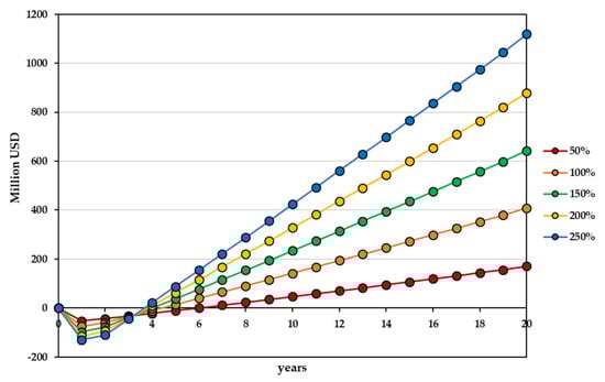 The increasing capacity also caused an increase in capital investment. The results showed that with 37.21 million USD capital investment, a profitable plant could be operated with 5.94 years of PBP and 171.5 million USD NPV after 20 years of operation. In other words, the investment required for producing one kilogram of ethanol was 1.73 USD/kg ethanol. On the other hand, if the conditions were available and 101.1 million USD could be invested, NPV reached 2.74 times higher than the initial capacity, and the capital investment could be gained back within 3.67 years. Although the capital cost increased by increasing capacity, the investment required for producing 1 kg of ethanol was reduced to 0.94 USD/kg ethanol. Similar to the results obtained in the study carried out by Rajendran et al. [], where the effect of the capacity change on base case process was investigated, the more the capacity was increased, the more the process became profitable. The cash flow diagram of processes with different capacities is shown in Figure 4.
