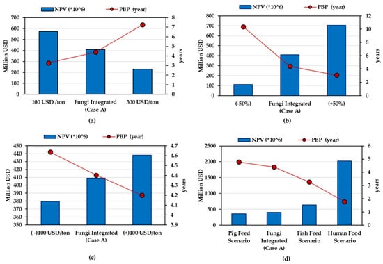 In the sensitivity analysis, the effect of reaching various markets with various selling prices on the process economy was analyzed, and the results are shown in Figure 5d. In Table 3, the potential market and price assumption are shown. The price range for fungal biomass was assumed to be varying in the range of 0.4–4 USD. If the biomass was sold as a protein-rich ingredient for pig feed, NPV after 20 years obtained was of 364 million USD, and the PBP was 4.79 years. If the biomass was sold in the fish feed market as a protein-rich fish feed ingredient, NPV after 20 years increased by 56%, while the PBP decreased to 3.27 years. If high-quality protein-rich biomass was sold in the human food market, NPV after 20 years was 4.93 times higher than the initial value, while the PBP was 1.79 years. With the current price of ethanol, in any market, where biomass is sold above 1.3 USD/kg, the biomass is the main contributor product to the process economy.
