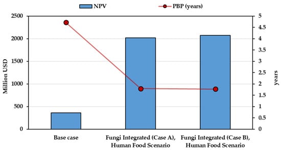 Comparison of NPV and PBP obtained from base case and filamentous fungi integrated process (both Case A and Case B) considering the use of the fungal biomass for the human food market. NPV, net present value; PBP, payback period.