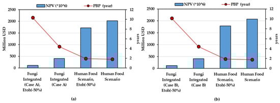 (a) The effect of decreasing ethanol selling price by 50% on fungi integrated process (Case A) and fungi integrated process (Case A) human food scenario; (b) The effect of decreasing ethanol selling price by 50% on fungi integrated process (Case B) and fungi integrated process (Case B) human food scenario.