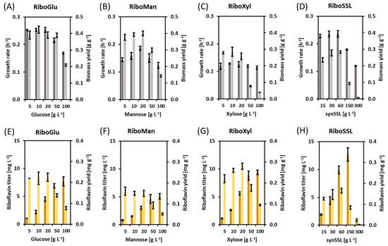 (A) Growth values of the strain RiboGlu. (B) Growth values of the strain RiboMan. (C) Growth values of the strain RiboXyl. (D) Growth values of the strain RiboSSL. (E) Production values of the strain RiboGlu. (F) Production values of the strain RiboMan. (G) Production values of the strain RiboXyl. (H) Production values of the strain RiboSSL. Upper plots depict growth rates [h−1] (dark grey bars), and biomass yields (g g−1) (light grey bars). Lower plots depict riboflavin titers [mg L−1] (dark yellow bars), and riboflavin yields (mg g−1) (light yellow bars). Values represent means and standard deviations.