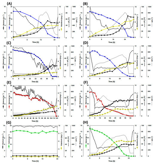 Growth and production of the strains RiboGlu, RiboMan, RiboXyl, and RiboSSL during bioreactor batch fermentations with 20 g L−1 glucose, mannose, or xylose as sole carbon source. The combination of strain and sugar is as follows: (A) RiboGlu plus glucose; (B) RiboMan plus glucose; (C) RiboXyl plus glucose; (D) RiboSSL plus glucose; (E) RiboGlu plus mannose; (F) RiboMan plus mannose; (G) RiboGlu plus xylose; (H) RiboXyl plus xylose. Data is depicted as follows: glucose consumption (blue line), mannose consumption (red line), xylose consumption (green line), riboflavin accumulation (yellow line), biomass formation (thick black line), stirring profile (thin black line), and pO2 profile (dotted line). One replication of each cultivation was carried out.