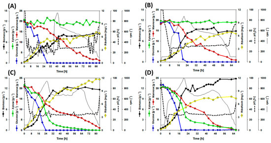 Bioreactor batch fermentations with 60 g L−1 synSSL as sole carbon source. (A) Growth and production of the strain RiboGlu. (B) Growth and production of the strain RiboMan. (C) Growth and production of the strain RiboXyl. (D) Growth and production of the strain RiboSSL. Data is depicted as follows: glucose consumption (blue line), mannose consumption (red line), xylose consumption (green line), riboflavin accumulation (yellow line), biomass formation (thick black line), stirring profile (thin black line), and pO2 profile (dotted line). One replication of each cultivation was carried out.