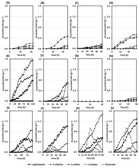 The by-products l-lactate, pyruvate, l-glutamate, l-alanine, and l-valine were monitored during the batch fermentations in bioreactors since they can be considered overflow metabolites in C. glutamicum [36,37,38]. When l-lactate, and pyruvate were observed, they were produced during the late exponential phase and were consumed during the stationary phase. The production of l-lactate and pyruvate were especially remarkable with the strains RiboXyl and RiboSSL growing on synSSL. RiboXyl accumulated up to 0.9 g L−1 of l-lactate. Regarding pyruvate, RiboXyl and RiboSSL accumulated up to 0.2 g L−1 (Figure 4K,L). When l-glutamate, l-alanine, and l-valine were produced they accumulated in the supernatant until the end of the processes. RiboGlu grown on mannose excreted overall 3.3 g L−1 of the three amino acids (Figure 4E). l-Glutamate was also a relevant by-product for the strains RiboMan and RiboSSL growing on synSSL, with titers of 1.0 and 1.1 g L−1, respectively. The amino acid l-alanine was mainly observed when growing the strains on synSSL, reaching values of 0.8, 1.0, 1.5, and 1.3 g L−1 (Figure 4I–L). Finally, the amino acid l-valine was generally produced during the stationary phase, and its highest titers were observed during growth in synSSL (Figure 4I–L). Production of l-valine was also prominent for the strain RiboMan grown in mannose (Figure 4F).