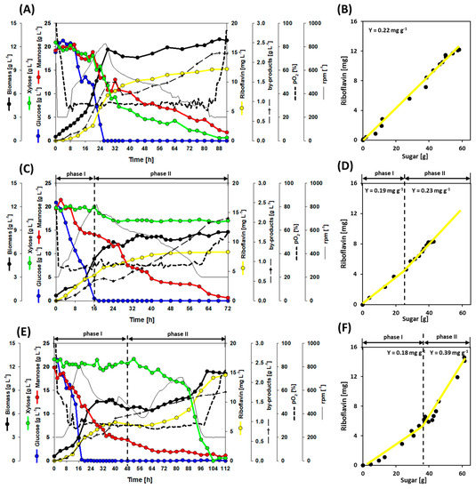 Growth and production of three independent co-cultivation batch fermentations with the strains RiboMan and RiboXyl. (A) RiboMan and RiboXyl were inoculated together at the beginning of the process; (B) yields for riboflavin achieved when inoculating RiboMan and RiboXyl together; (C) RiboXyl was inoculated during the exponential phase of RiboMan; (D) yields for riboflavin achieved when inoculating RiboXyl during the exponential phase of RiboMan where phase I indicates before inoculation of RiboXyl and phase II indicates after inoculation of RiboXyl; (E) RiboXyl was inoculated during the stationary phase of RiboMan; (F) yields for riboflavin achieved when inoculating RiboXyl during the stationary phase of RiboMan where phase I indicates before inoculation of RiboXyl and phase II indicates after inoculation of RiboXyl. Data is depicted as follows: glucose consumption (blue line), mannose consumption (red line), xylose consumption (green line), riboflavin accumulation (yellow line), biomass formation (thick black line), stirring profile (thin black line), pO2 profile (dotted line), and the sum of by-products (dashed line) (by-products details in Figure 6). One replication of each cultivation was carried out.