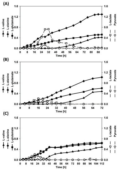 - Khuat, H.B.T.; Kaboré, A.K.; Olmos, E.; Fick, M.; Boudrant, J.; Goergen, J.-L.; Delaunay, S.; Guedon, E. Lactate production as representative of the fermentation potential of Corynebacterium glutamicum 2262 in a one-step process. Biosci. Biotechnol. Biochem. 2014, 78, 343–349. [Google Scholar] [CrossRef][Green Version]
