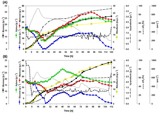 By the end of the process with strain RiboSSL, the values for riboflavin titer, yield, and volumetric productivity of 19.0 mg L−1, 0.50 mg g−1, and 0.16 mg L−1 h−1, respectively, were reached (Figure 7A). The final titer of the amino acids l-glutamate, l-alanine, and l-valine were 1.5, 1.6, and 0.6 g L−1. Up to 1.2 g L−1 of l-lactate and 0.2 g L−1 of pyruvate were observed, although they were consumed almost entirely through the fermentation (Figure 7A and Figure 8). The total yield of by-products on substrate was 0.10 g g−1. A maximal biomass concentration of 26.6 g L−1 was reached. Although glucose was fully depleted, 27.4 g L−1 of mannose and 25.6 g L−1 of xylose remained in the supernatant. However, the process was already finished since pO2 exceeded 50% (Figure 6A).