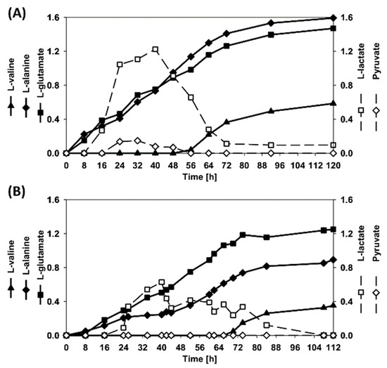 The co-cultivation operation with RiboMan and RiboXyl showed improved production values. After the fermentation was concluded, 27.3 mg L−1 of riboflavin were accumulated within 112 h, which is equivalent to a productivity of 0.25 mg L−1 h−1 (Figure 7B). The riboflavin yield of 0.52 mg g−1 was slightly higher during this co-cultivation process as compared to the monoculture. By-product accumulated to 2.5 g L−1 at the end of the fermentation, of which 1.2 g L−1 were l-glutamate, 0.9 g L−1 l-alanine, and 0.4 g L−1 l-valine. Pyruvate was not observed, while l-lactate accumulated to a titer of approx. 0.1 g L−1 before being consumed. The total by-products yield was 0.05 g g−1 (Figure 7B and Figure 8), and the final biomass was 33.6 g L−1. The co-cultivation of RiboMan with RiboXyl was able to consume all glucose, but 16.4 g L−1 of mannose and 19.7 g L−1 of xylose remained in the broth (Figure 7B).
