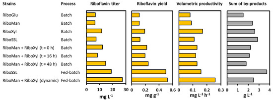 Based on the results above, the riboflavin production values obtained in the bioreactor experiments confirmed our shake flask experiments, overexpression of xylAB was mandatory for the consumption of xylose by C. glutamicum; RiboXyl growing on 60 g L−1 of synSSL as the carbon source achieved better production values than RiboSSL under the same conditions; the overexpression of manA was needed for a faster process; and the consumption of the three sugars together enhanced by-product formation.