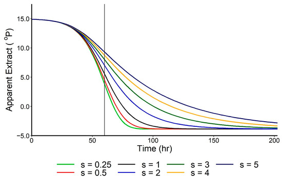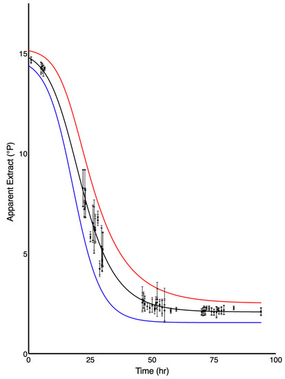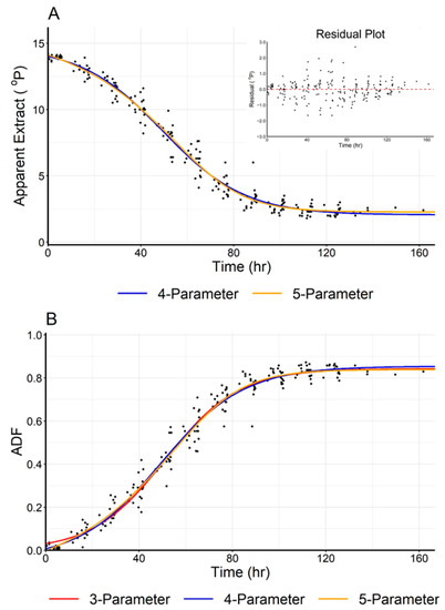 where ADFt is the ADF at any time t or (P0 − Pt)/P0), ADFe is the asymptotic limit and B and M are parameters as described in the logistic model (Equation (1)). Equation (3) effectively takes the form of a three-parameter logistic function. This model relies on the assumption that the final condition forms an asymptote parallel to the x axis. In the case of ADF, the initial condition (equivalent to Pi in the four-parameter model) is assumed to form this asymptote. The difficulty with the use of this method as reported is that the Original Gravity or P0 must be fixed rather than be free to allow the best fit. Practically, P0 is set to the largest density value in the fermentation dataset. This procedure is analogous to assuming or fixing an intercept in linear regression, limiting one’s ability to accurately predict the change in the dependent variable ADFt.