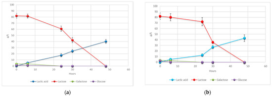 Both graphs show the depletion of lactose, galactose and glucose over 48 h as the concentration of LA increases. As expected, LA is production is mostly attributable to the consumption of lactose, but L. casei uses also glucose and galactose as carbon source [43]. The effect of temperature seems to be the occurring of a prolonged lag phase at 30 °C. At 37 °C, lactose concentration does not decrease significantly until the complete depletion of glucose and galactose. The higher yield of LA at 37 °C is coherent with results previously obtained [44] at the same pH value and with an inoculum age of 24 h, as in our study. Nevertheless, considering the very slight difference in both yield and productivity between the two temperatures tested, we decided to use 30 °C as reference temperature because of the advantages in terms of process costs to maintain higher temperature. In fact, 30 °C can be considered as room temperature in summer in Italy and any equipment has to be provided to heat the fermenter.