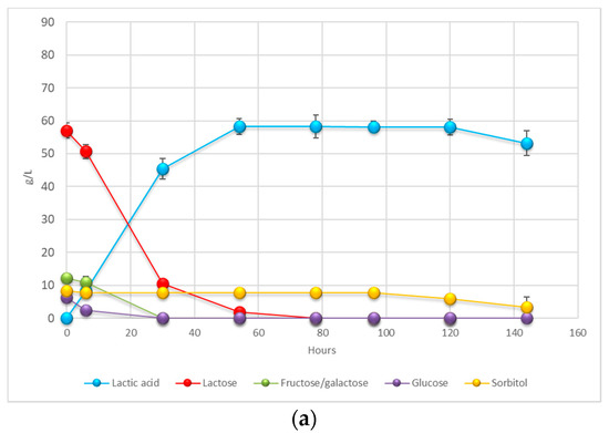 Scaling up to the fermenter scale, different kind of pretreatments have been investigated, in order to reduce as much as possible, the process costs, as mentioned above. In particular, a comparison between grinded PPT and grinded and the supernatant of grinded and centrifuged PPR has been attempt. The supernatant would contain soluble sugars and nutrients, and by removing the fibrous part, the culture medium appears less dense and viscous. The results of this test may also be important for the purpose of recovering LA from the fermentation broth and for the setup of the downstream protocol. Considering the fact that centrifugation reduces the mass by approximately 50%, the amount of PPR has been appropriately increased to 90:10, in order to maintain the same total sugars content of the two batches. Table 5 shows the sugar concentrations of the respective starting mixtures with RCW + PPR in both cases. It is worthwhile noting that, even if the total sugars concentrations are almost identically in the two cases, the sugars speciation is different, due to the more percentage of RCW in the 90:10 ratio fermentation, which enriches the medium of lactose. Fructose and galactose have been reported as a sum because in the HPLC elution conditions this two isomers cannot be differentiated, having the same retention time. Sorbitol, as well as fructose, derived from PPR, being both among the principal components of soluble organic matter of pears.