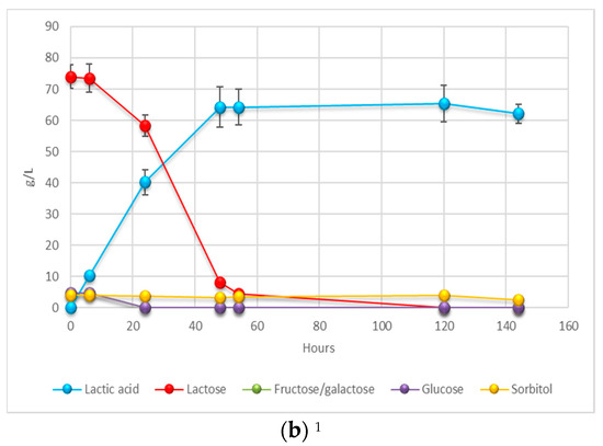As a result, the removal of the fibrous part of PPR does not seem to provide significant differences in the production yield. The greatest amount as absolute value of LA (65.4 g/L) derives from the greatest amount of fermentable sugars in the starting mixture (84.5 g/L). Moreover, being similar the process duration until the complete sugars depletion, the volumetric productivity is similar (Qp = 1.05 g/L·h and Qp = 1.12 g/L·h, respectively).