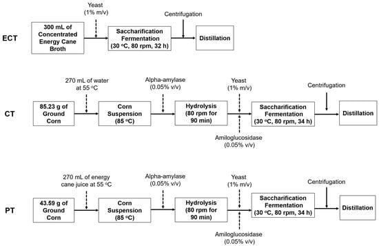 Diagrams summarizing the processes performed in the treatments with energy cane (ECT), with corn (CT), and mixing energy cane juice and corn (PT).