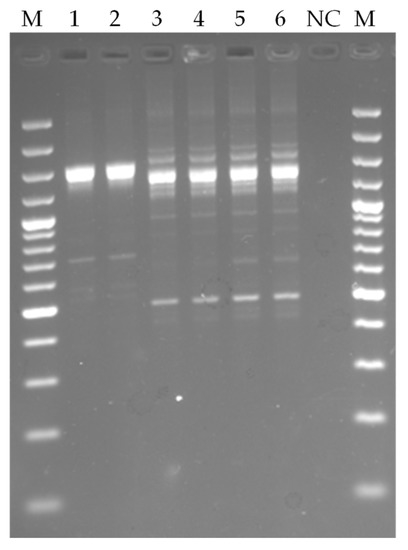Image of agarose gel showing randomly amplified polymorphic DNA profiles of commercial starter lactic acid bacteria (LAB). Lanes M, GeneRuler 100 bp plus DNA ladder (Thermo Fisher Scientific, Inc., Vilnius, Lithuania); lanes 1-2, strain 1; lanes 3-6, strain 2; lane NC, negative control.