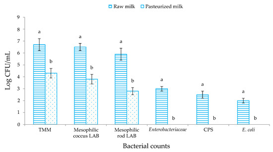 Microbial loads (Log CFU/mL) of raw and pasteurized milk samples. Abbreviations: TMM, total mesophilic microorganisms; CPS, coagulase-positive staphylococci; E., Escherichia. Results indicate mean values and standard deviation of six determinations (carried out in duplicate for three independent productions). Different superscript letters indicate significant differences on microbial concentrations according to Duncan’s test between raw and pasteurized milk samples for p < 0.05.
