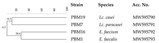 These strains were identified at the species level by sequencing of the 16S rRNA gene, indicating that the thermoduric indigenous milk LAB included species within the genera Enterococcus and Lactobacillus. The last genus included two strains belonging to the species Lacticaseibacillus casei (PBM19) and Lacticaseibacillus paracasei (PBM7) (named Lactobacillus casei and Lactobacillus paracasei, respectively, before reclassification of Zheng et al. [47]). Regarding the Enterococcus genus, one strain was identified as Enterococcus faecalis (PBM1), while the strain PBM16 could not be identified at the species level due to the different results of the BLAST and EzTaxon searches. This strain was further analyzed by a species-specific multiplex PCR assay and classified as Enterococcus faecium. All the species identified are components of the nonstarter LAB (NSLAB) community implicated in cheese maturation [39], commonly associated with raw milk [48] and cheeses [44,49]. However, their presence in pasteurized milk is mainly due to postpasteurization contamination [50] or to their ability to survive the pasteurization process [51,52].