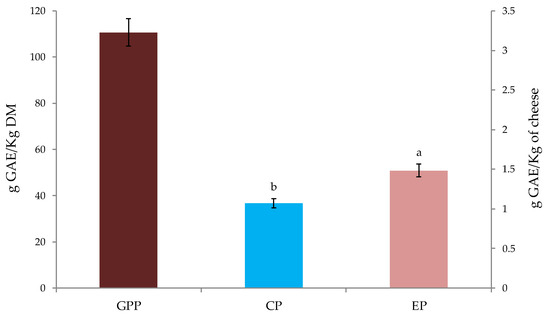 Total polyphenolic content (TPC) of GPP and cheese samples. Units are g GAE/Kg DM for GPP sample and g GAE/Kg for control and experimental cheese samples. Abbreviations: GPP, grape pomace powder; CP, control production inoculated with a commercial starter culture; EP, experimental production inoculated with a commercial starter culture + 1% of GPP. Results indicate mean values and standard deviation of six determinations (carried out in duplicate for three independent productions). Different superscript letters indicate significant differences on TPC according to Duncan’s test between control and experimental cheese samples for p < 0.05.