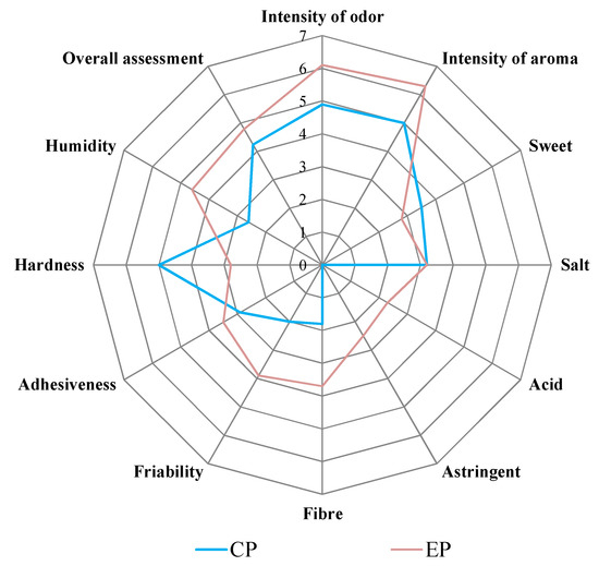 Spider diagrams corresponding to the descriptive sensory analysis of cheeses. Abbreviations: CP, control production inoculated with a commercial starter culture; EP, experimental production inoculated with a commercial starter culture +1% of GPP.