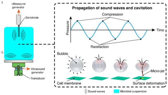 Schematic presentation of the formation of micro-jets through the collapse of acoustic cavitation bubbles. (i) Ultrasonic probe-based system, (ii) Ultrasonic transducer-based system (ultrasonic bath). Reprinted from [51].
