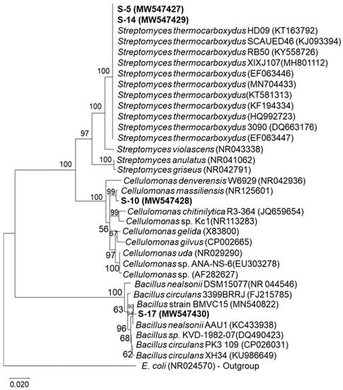 The phylogenetic tree was constructed with the closest sequences found within the NCBI GenBank and E. coli as an out-group. The phylogenetic analysis indicated that the Cellulomonas strain (isolate S-10) and Bacillus sp. (isolate S-17) were clustered with other strains of Cellulomonas massiliensis and Bacillus strain, respectively, with high bootstrap support value. Similarly, Streptomyces strains (isolate S-5 and isolate S-14) were grouped with Streptomyces thermocarboxydus (Figure 1).