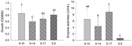 Bacterial growth and enzyme activity produced by isolates. The bar represents the mean of bacterial growth and enzyme activity. The statistical analysis was performed with one-way ANOVA followed by a post hoc Tukey comparison test. Letters above each bar represent statistical significance at p < 0.05.