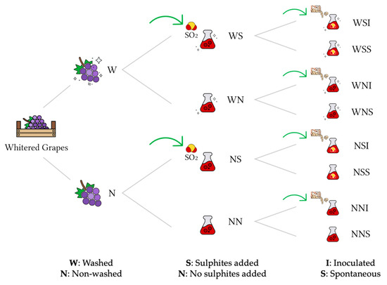 Microbiological and chemical analyses were conducted on grape musts, washing solutions, and wines to evaluate the impact of grape washing, SO2 addition, and starter inoculation on the progress and outcomes of the lab-scale winemaking process. These three variables were combined following the experimental design shown in Figure 1.