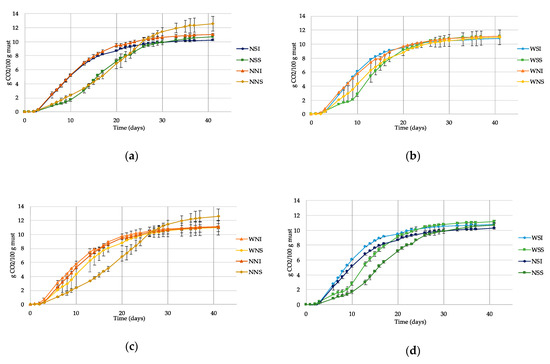 Moreover, it is interesting to note the different behavior of NNS with respect to the other fermentations, since it reached the highest CO2 production after 30 days, and the fermentative activity continued until the end of the trials. This could be related to the growth of native S. cerevisiae yeasts characterized by high alcohol-tolerance and fermentative activity, which were possibly suppressed by the applied interventions in the other trials.