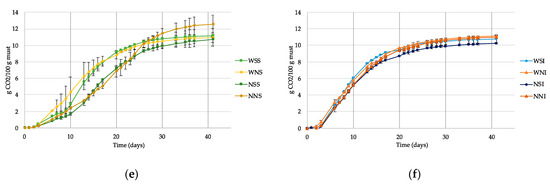 Fermentation kinetics of the eight types of microvinification trials of grape musts grouped according to treatment: washing (top panels, first letter N or W), SO2 addition (middle panels, second letter N or S), and starter inoculation (bottom panels, third letter S or I). Non-washed (a) or washed grapes (b), no addition (c) or addition of SO2 (d), spontaneous (e) or inoculated fermentation (f).