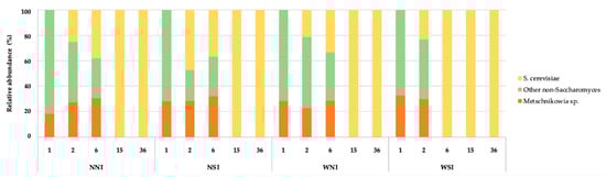 The analysis after 15 and 36 days (Figure 5) revealed the dominance of S. cerevisiae. Indeed, it has been reported that non-Saccharomyces species cannot withstand the competition with the wine yeast S. cerevisiae, which is more tolerant to the ethanol and CO2 produced during fermentation [19,25,41].