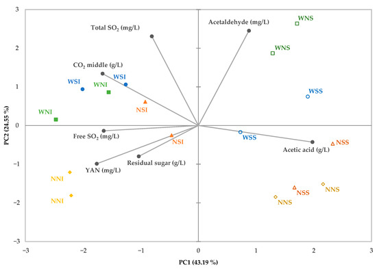 A good reproducibility of the replicates was observed, and some particular effects caused by the different treatments, as discussed above, were highlighted. The first component (PC1) discriminated the wines obtained from spontaneous fermentations from the ones obtained from inoculated ones, mainly based on the different content of acetic acid, YAN, and free SO2 in the final wines and the CO2 release by the middle of fermentation.